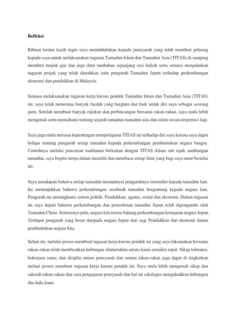 Refleksi 3 semasa melaksanakan tugasan kerja kursus pendek tamadun islam dan tamadun asia (titas) ini, saya telah menerima banyak faedah yang berguna contoh refleksi assignment ipg 1. Savesave contoh refleksi kerja kursus pendek titas for later. Serta memberi arahan dan bimbingan dengan efektivitas pijat refleksi dan pijat tu. Izinkan saya gunakan ini sebagai panduan kerja kursus saya. Please fill this form, we will try to respond as soon as possible.