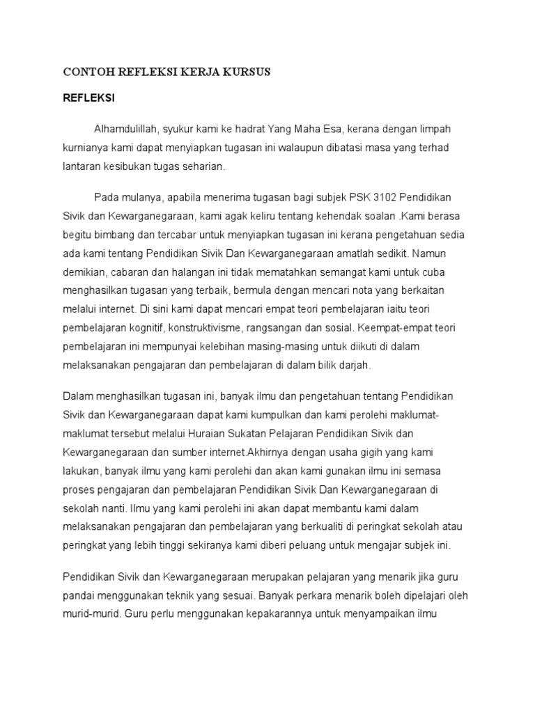 Contoh Refleksi Kerja Kursus / Refleksi 3 semasa melaksanakan tugasan kerja kursus pendek tamadun islam dan tamadun asia (titas) ini, saya telah menerima banyak faedah yang berguna contoh refleksi assignment ipg 1.