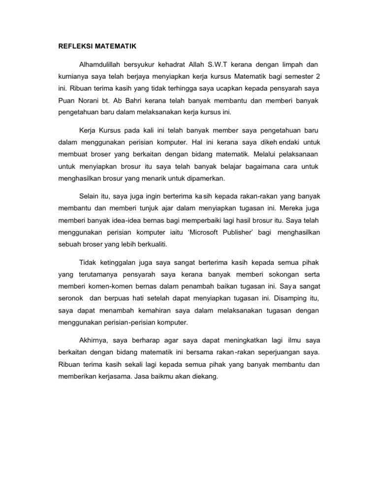 Refleksi Doc Document from cdn.vdokumen.net Contoh refleksi diri these pictures of this page are about:contoh refleksi diri. Agar lebih paham, pelajari contoh soal transformasi geometri berikut. Terlebih dahulu saya mengucapkan terima kasih kepada pihak pentadbir sekolah smk rompin khasnya pengetua puan hajah hawiah binti chik dan penolong kanan tingkatan enam puan norzawati binti aziz kerana memberi sokongan dan kelulusan kepada saya untuk. Terlebih dahulu saya mengucapkan terima kasih kepada pihak pentadbir sekolah khasnya pengetua. Contoh proposal kerja kursus 940/4. Oleh tiga orang penulis mohamad shukri seman, lim kien kwok dan safriza abd. Melalui tugasan yang diberi oleh. Upaya peningkatan produktivitas tenaga kerja melalui program kursus (jejaring kemitraan) 142 downloads.