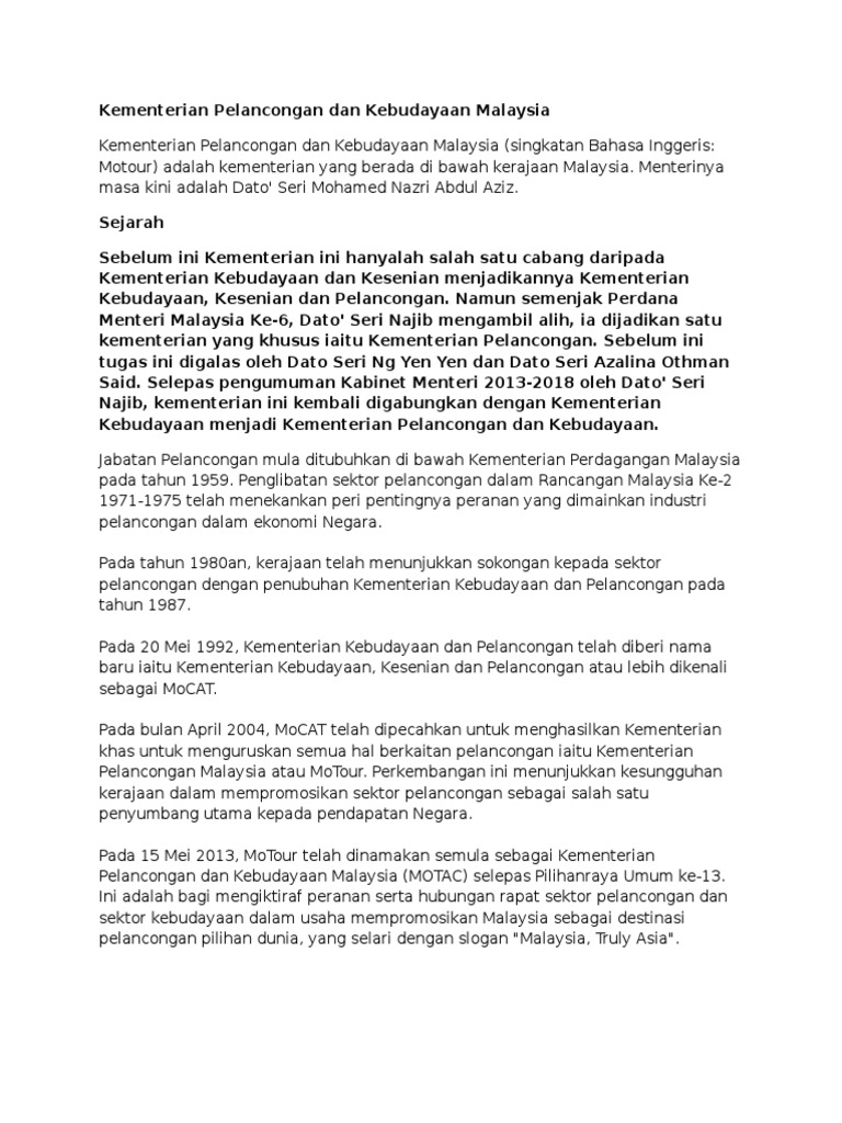 Kementerian Pelancongan Dan Kebudayaan Malaysia - Mendapat pengiktirafan daripada kementerian pelancongan & kebudayaan malaysia.. For faster navigation, this iframe is preloading the wikiwand page for kementerian pelancongan, kesenian dan kebudayaan malaysia. Kementerian pelancongan, kesenian dan kebudayaan (motac) akan menawarkan kursus dalam talian percuma kepada semua pemandu pelancong yang berhasrat untuk memperbaharui lesen mereka. The history of the department of tourism (malaysia) was first set up under the ministry of trade in 1959. See more of kementerian pelancongan, seni dan budaya malaysia on facebook. Borang perakuan perbadanan syarikat (form 9) dan borang 13 (jika ada pertukaran nama).