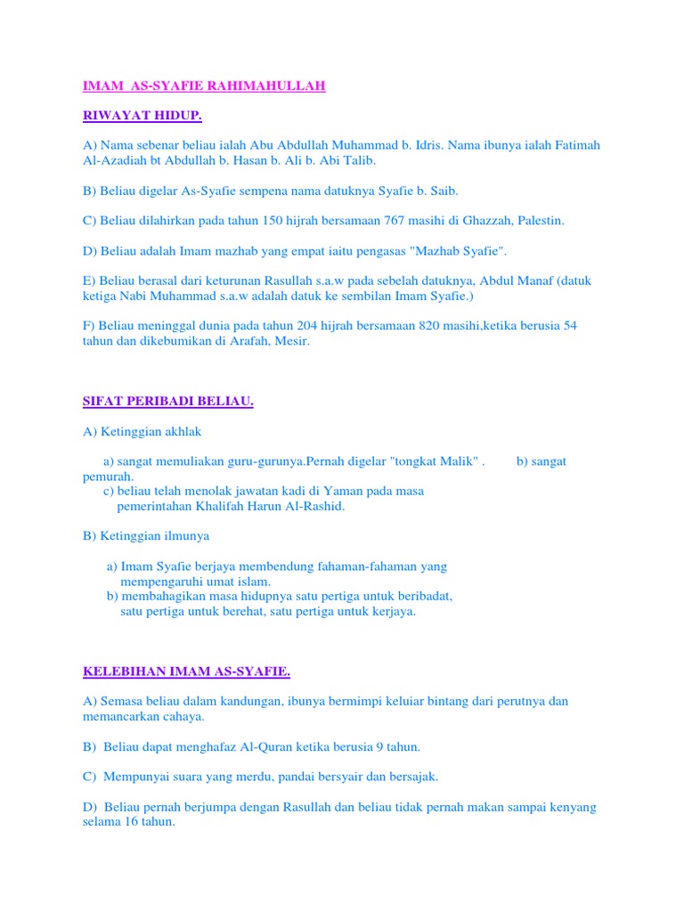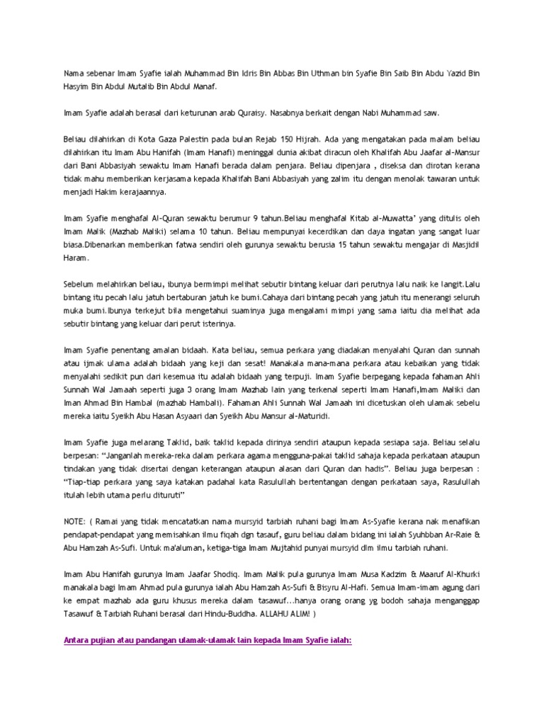 Biodata Imam Syafie Pdf Biodata Imam As Syafie Imam As Syafie Atau Nama Sebenar Beliau Ialah Muhammad Bin Idris Bin Al Abbas Bin Usman Bin Syafi U2019 Course Hero from www.coursehero.com Imam syafii kemudian merumuskan aliran atau mazhabnya sendiri, yang dapat dikatakan berada di antara kedua kelompok tersebut. Nama aslinya adalah muhammad bin idris. Namun ayahanda imam syafi'i telah meninggal lebih dulu dan ibunya membawa imam syafi'i untuk pindah ke kota makkah sejak usianya dua tahun. Jangan keliru, inilah sunah malam jumat yang sebenarnya !! Beliau mengemukakan pendapat kepada sang guru. Pada usia 15 tahun, keilmuan imam syafi'i sudah dinilai setara dengan mufti. Biografiku.com | imam syafi'i dikenal oleh umat islam sebagai sebagai salah satu tokoh besar dalam islam. Niscaya allah akan memberinya rezeki.